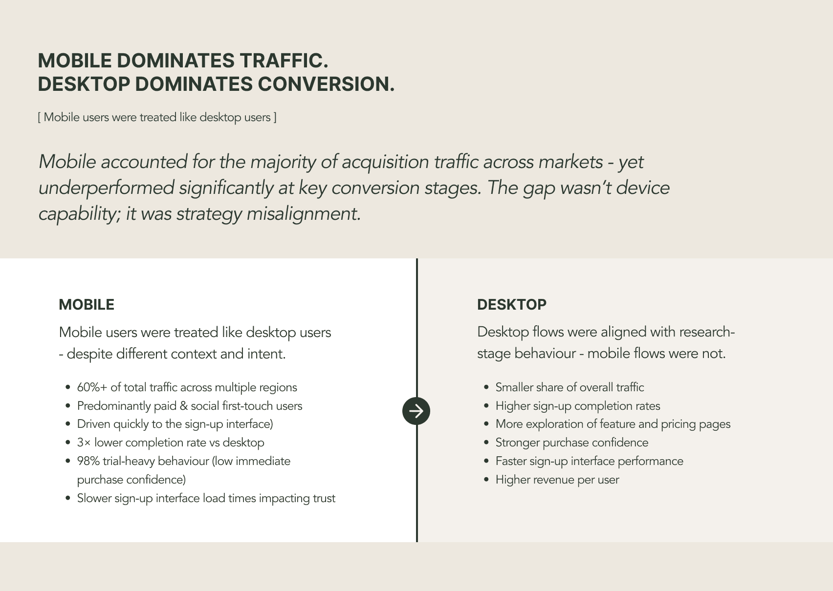 The problem stated plainly: 60%+ of traffic on mobile, yet desktop held the conversion advantage. The gap was strategy, not capability.