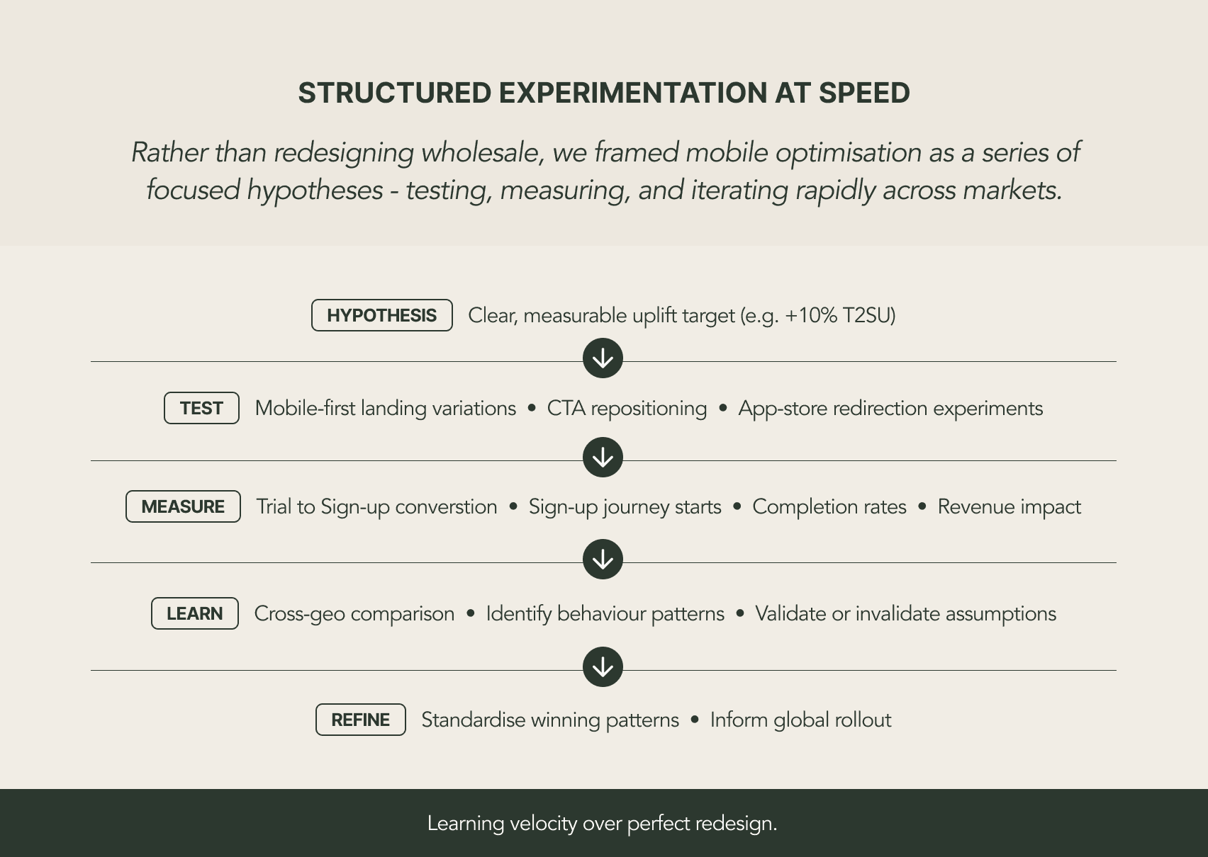 The discipline was learning velocity over perfect redesign. Relatively lightweight mobile-specific changes produced strong early signals - which reinforced that the unlock was strategic reframing, not wholesale visual overhaul.
