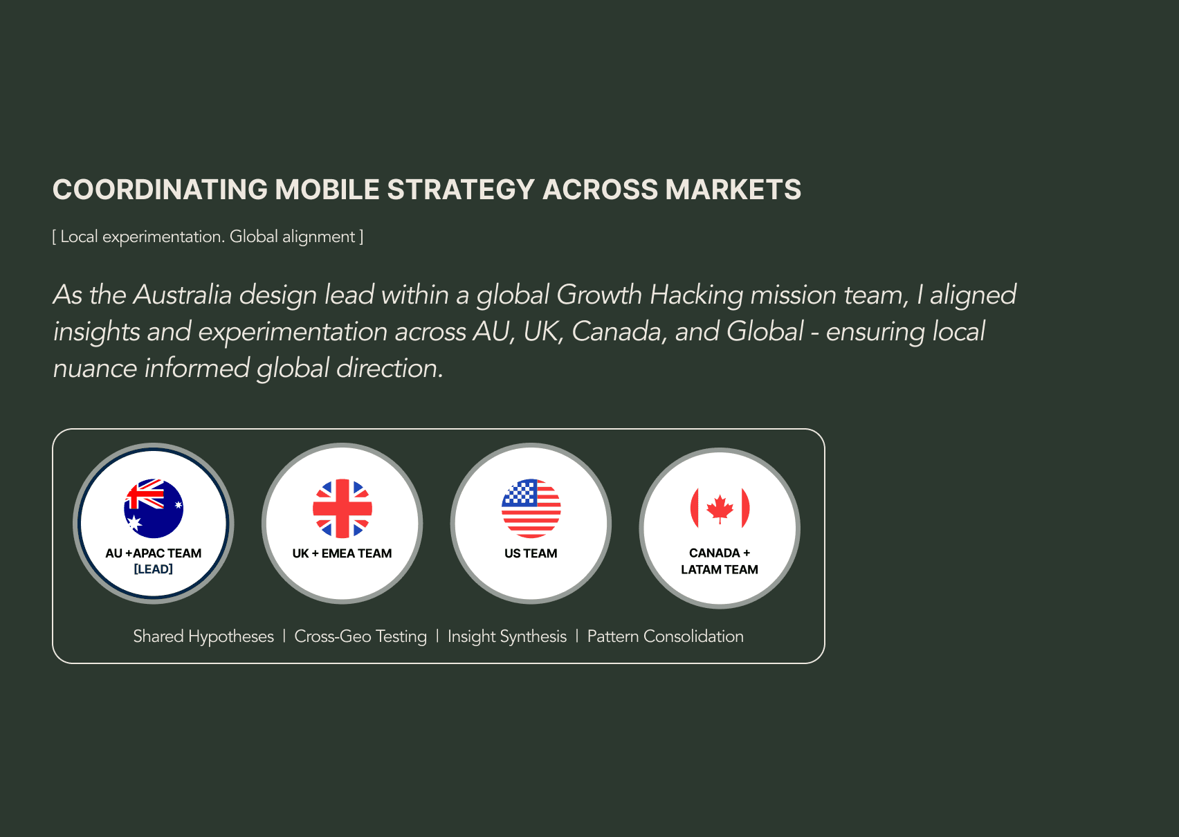 The mission team structure: AU as lead, coordinating with UK, Canada, and US teams through shared hypotheses, cross-geo testing, and insight synthesis.