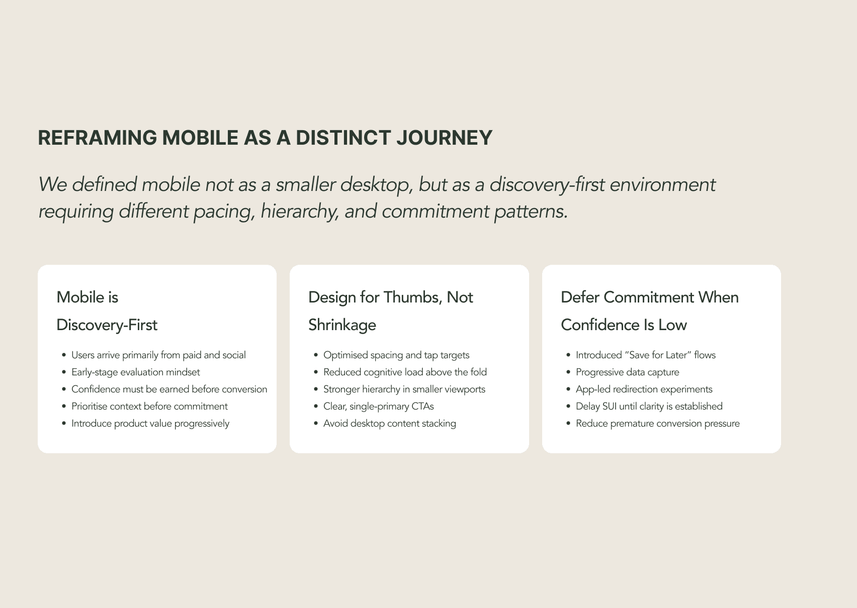 This wasn't a list of UX best practices. It was a deliberate strategic position that ran counter to how mobile had been treated previously - as a responsive version of the desktop experience rather than a distinct acquisition channel with its own intent model.